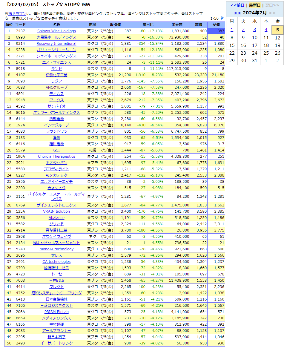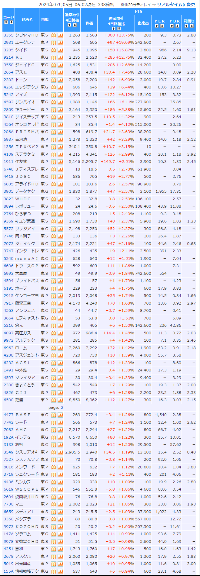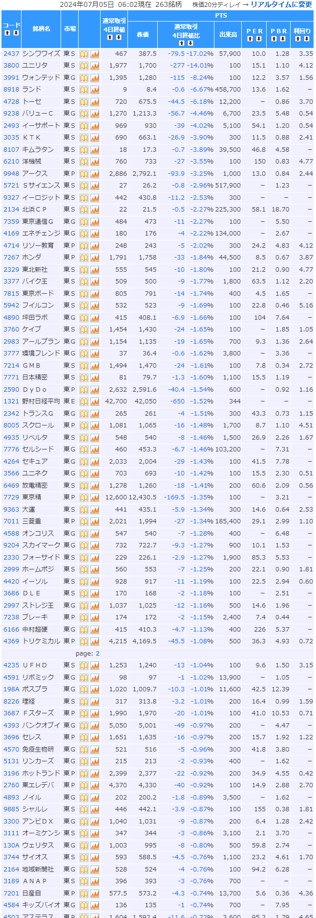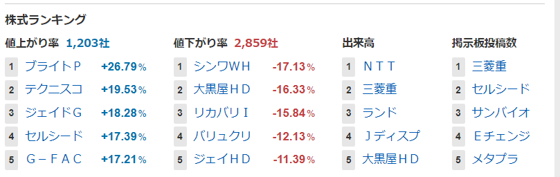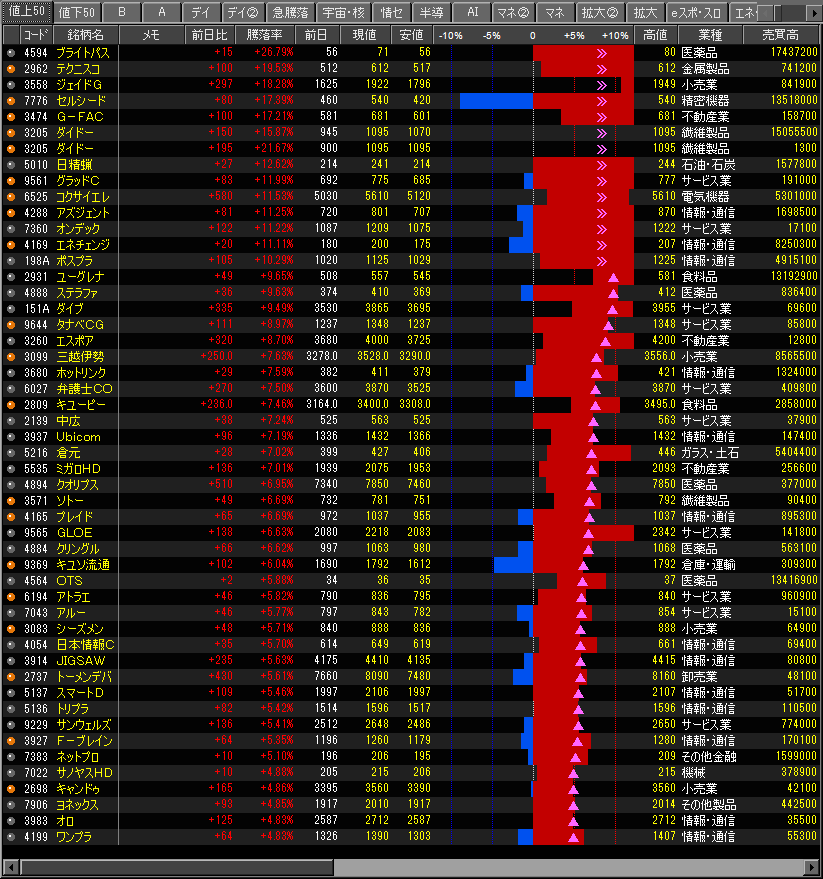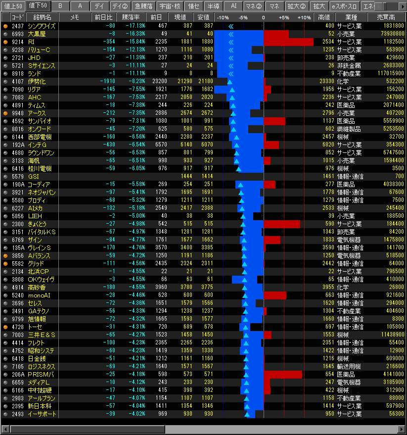 安川電、マニー、サンエー、アークランズ、ハイデ日高、トーセイ、サーラ、薬王堂HD、北興化、和田興産、岡野バル