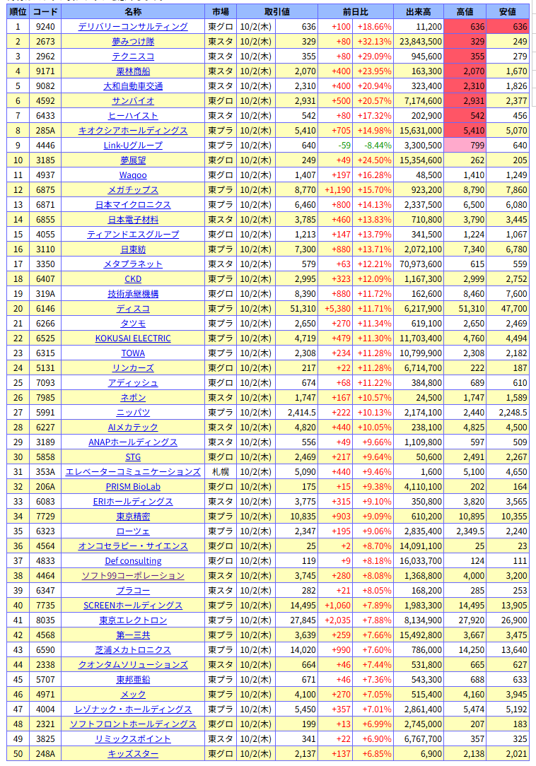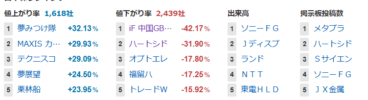 値上がり率ランキング