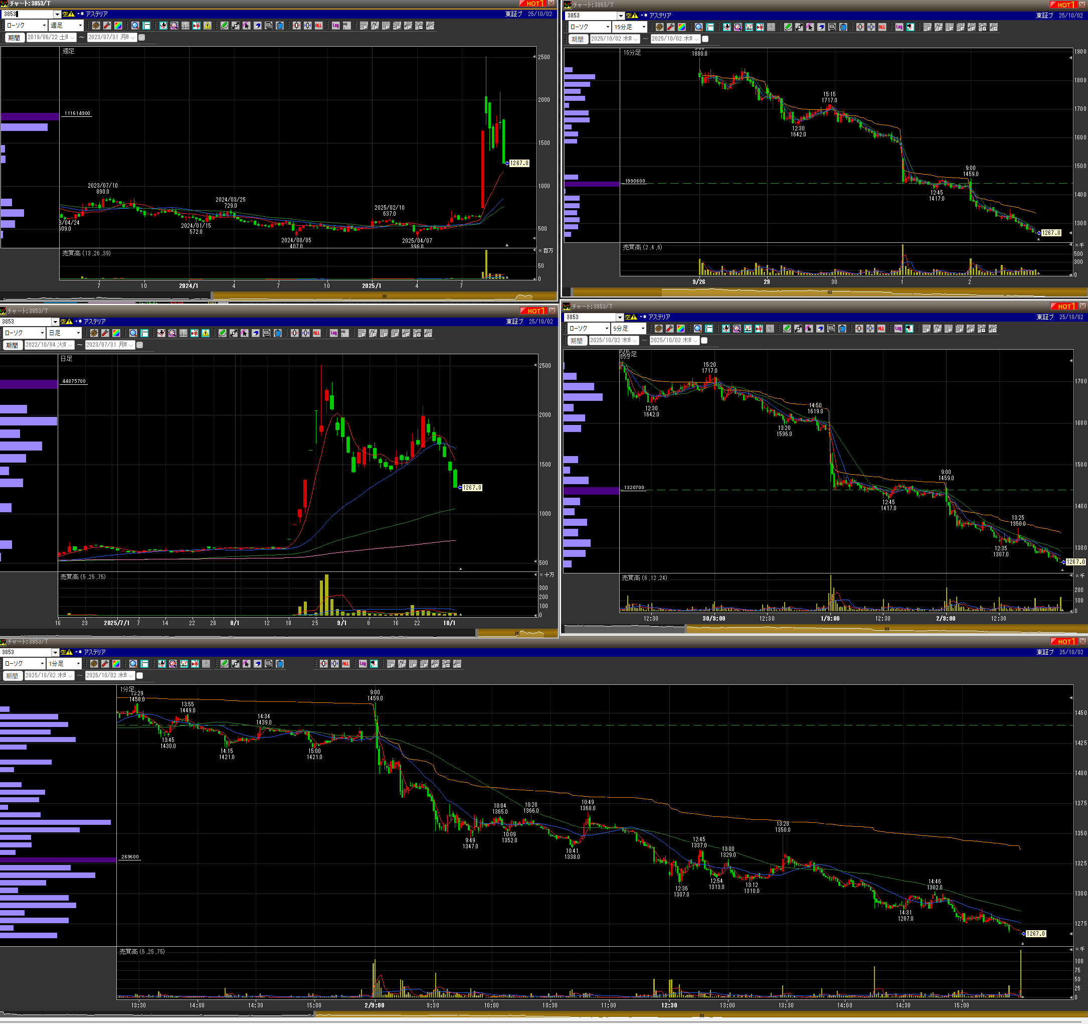 ・平均1230辺りで、現物信用と持ってましたが、売り時が何度もあったにも関わらず、祭り期待でホールドしてましたが、いってこいの連続