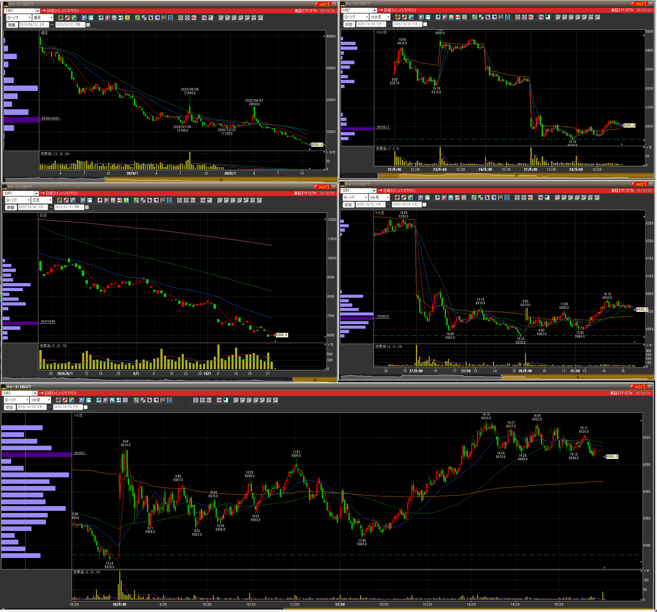 ・寄り付きに(売り)入りたかったんですけど、中々売りたい位置にこず、ズルズル下がってる所を追いかけて入る形が多く、建てたら上がってくるパターンに