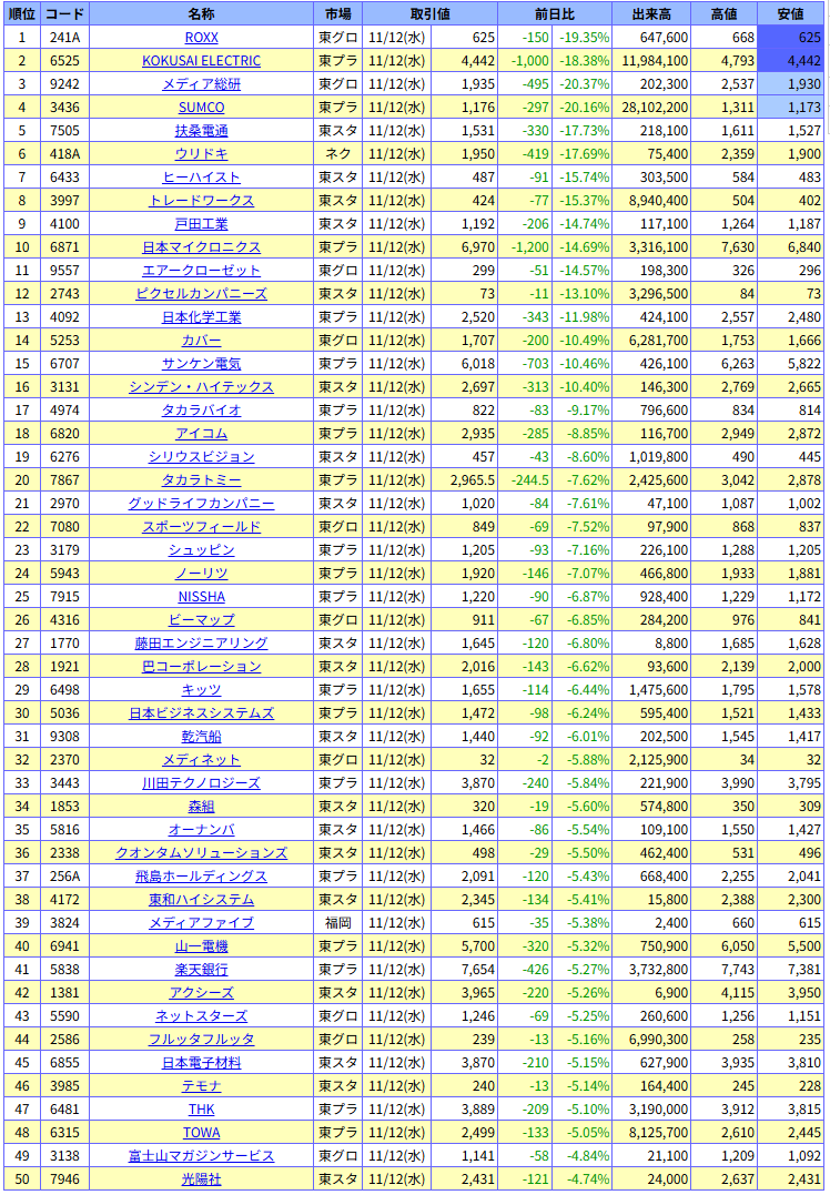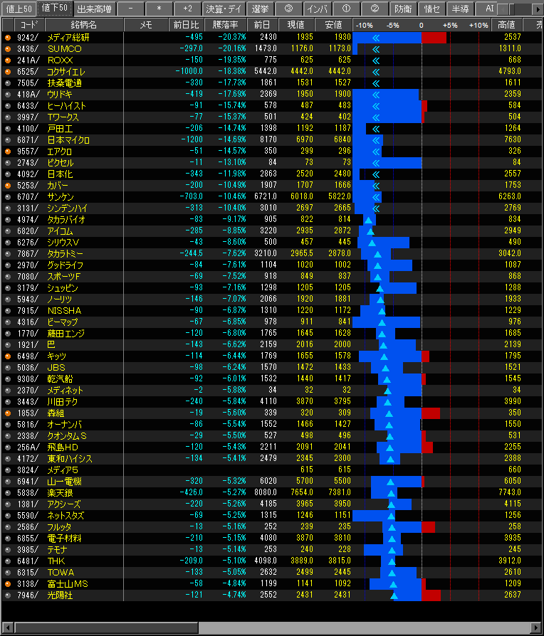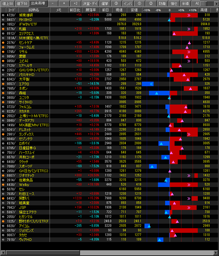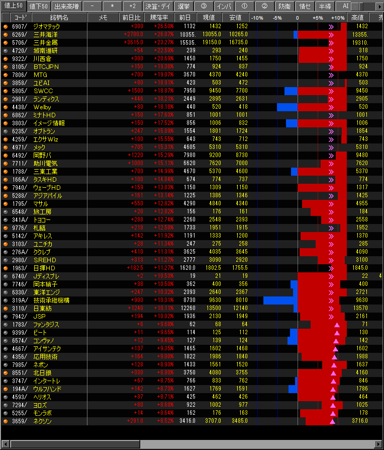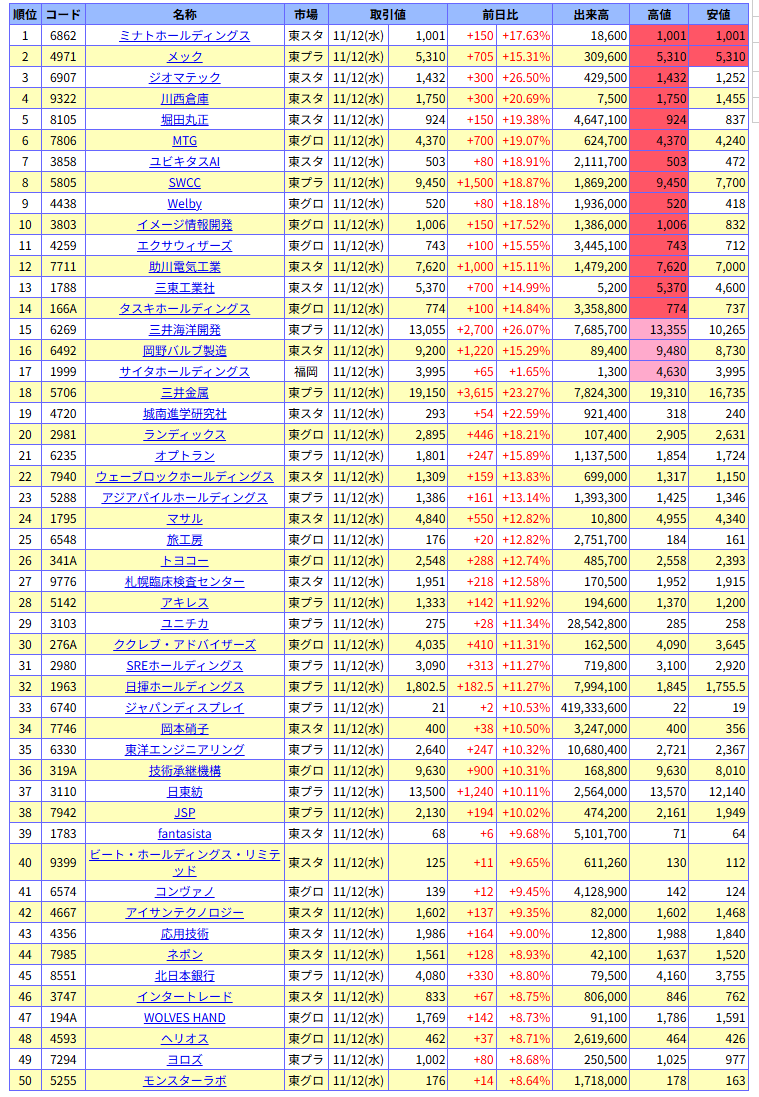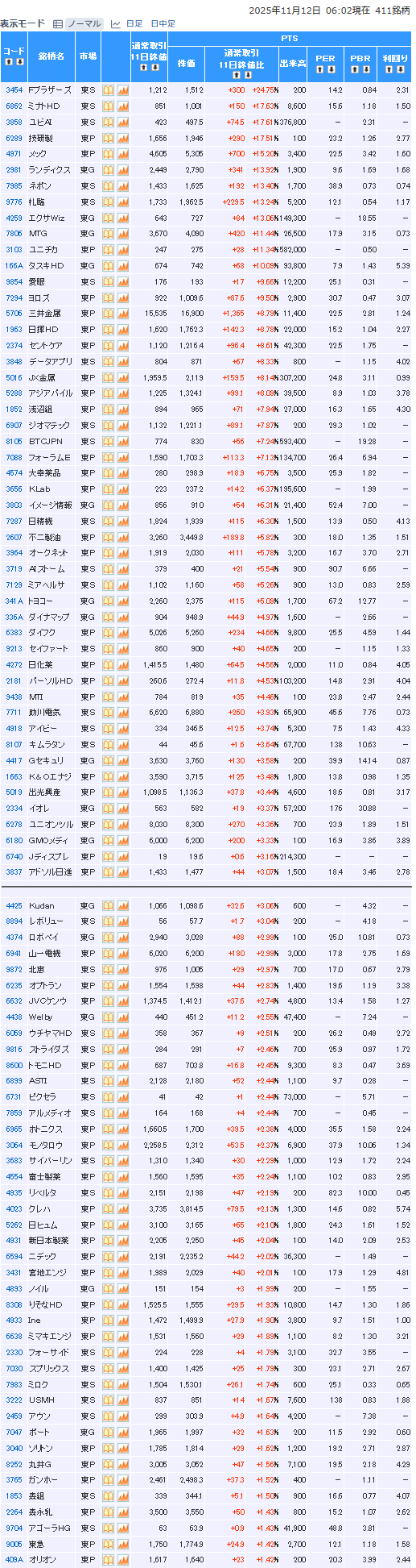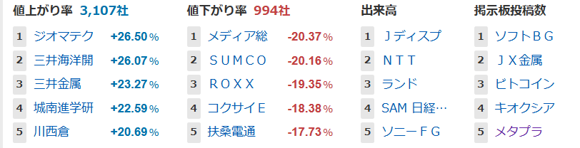 ブリヂストン、オリックス、テルモ、三住トラスト、パンパシHD、アシックス、ENEOS、エムスリー、いすゞ、トレンド、NXHD、長谷工、三井海洋、ニッパツ、TOYOTIRE、三井E&S、サッポロHD、クラレ、住友ゴム、デクセリアルス、セイノーHD、東邦HD、DOWA、石油資源、ワコールHD、カネカ、ハーモニック、シチズン、SWCC、森永菓、TKC、Jマテリアル、ペプチド、カヤバ、タクマ、JACR、リョーサン菱、三谷セキ、キッツ、山善、SBSHD、PHCHD、インテグラル、高松G、松田産業