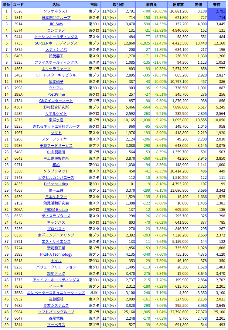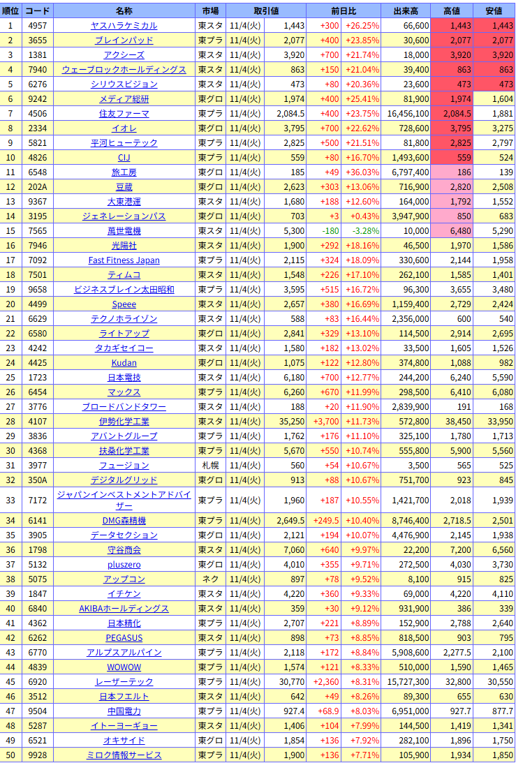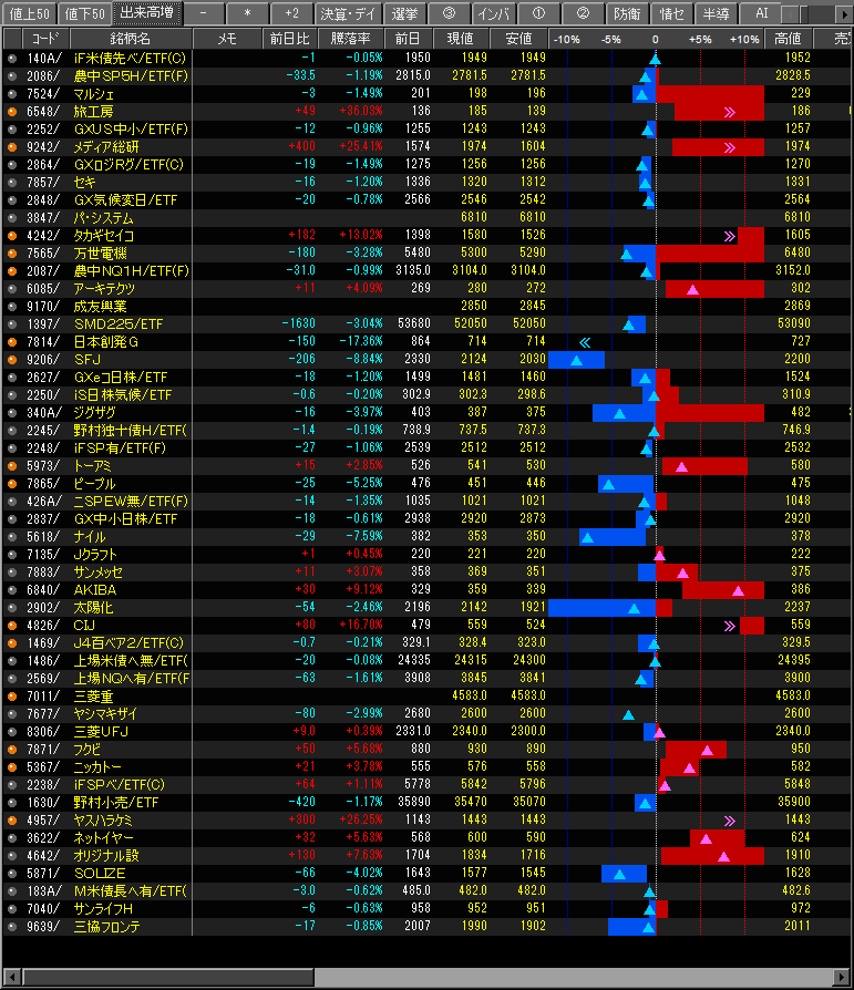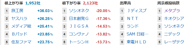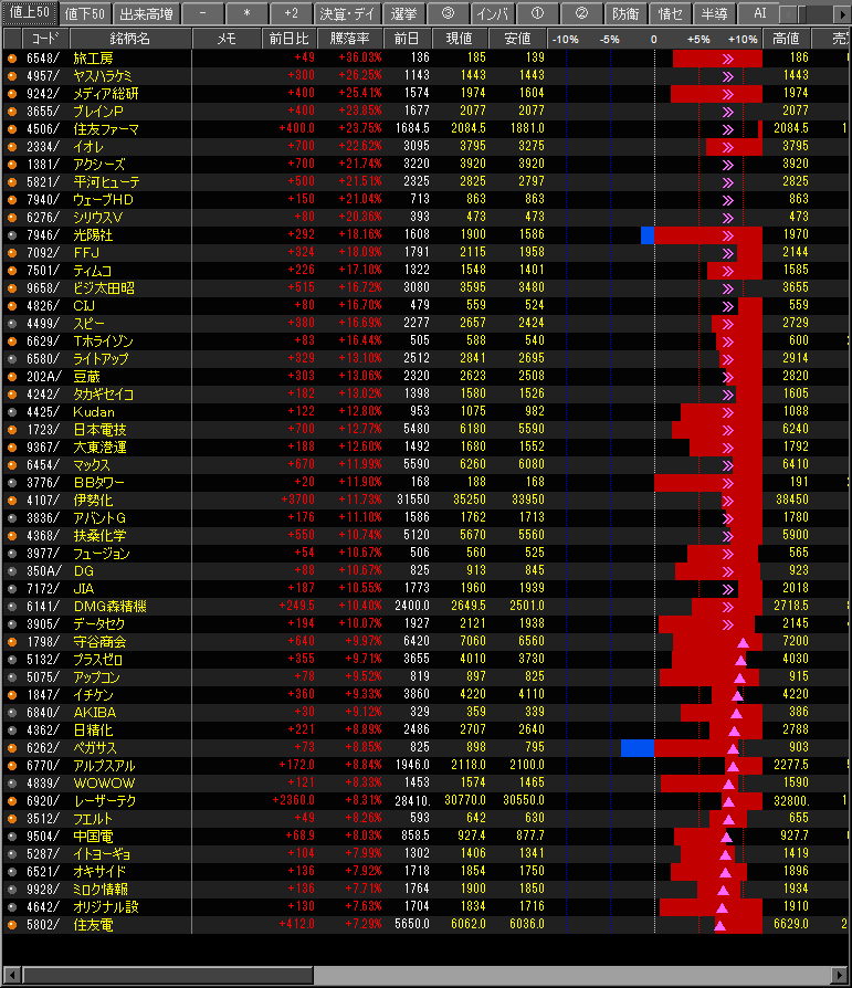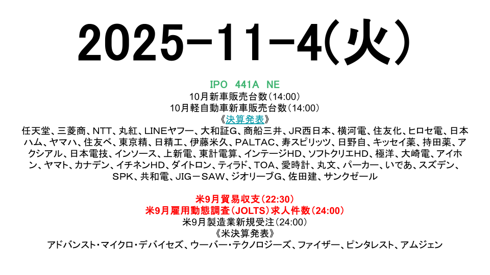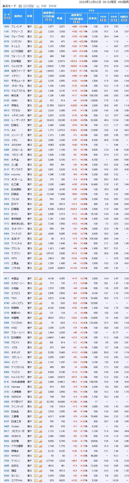 任天堂、三菱商、NTT、丸紅、LINEヤフー、大和証G、商船三井、JR西日本、横河電、住友化、ヒロセ電、日本ハム、ヤマハ、住友ベ、東京精、日精工、伊藤米久、PALTAC、寿スピリッツ、日野自、キッセイ薬、持田薬、アクシアル、日本電技、インソース、上新電、東計電算、インテージHD、ソフトクリエHD、極洋、大崎電、アイホン、ヤマト、カナデン、イチネンHD、ダイトロン、ティラド、TOA、愛時計、丸文、パーカー、いであ、スズデン、SPK、共和電、JIG-SAW、ジオリーブG、佐田建、サンクゼール