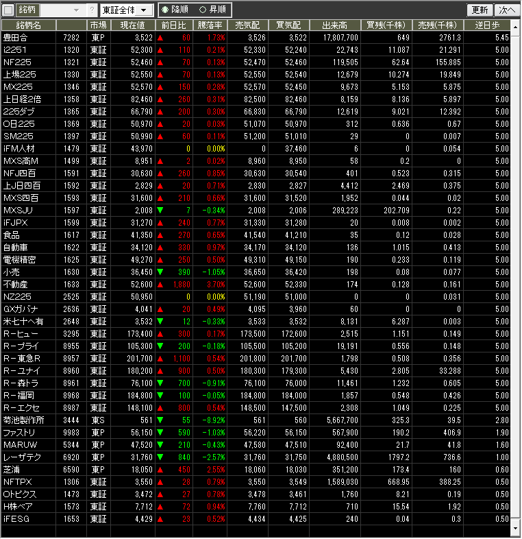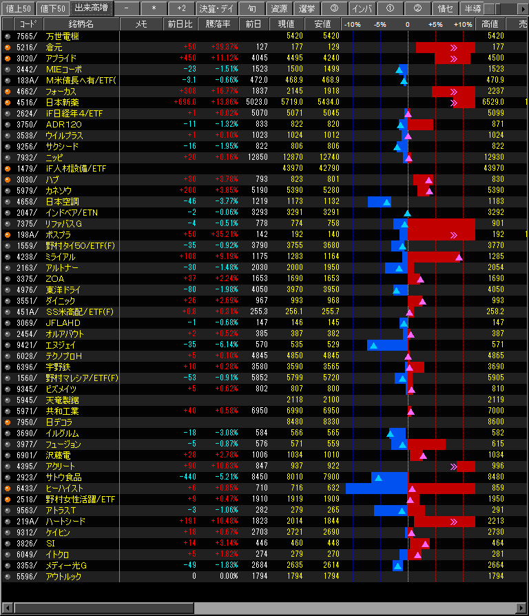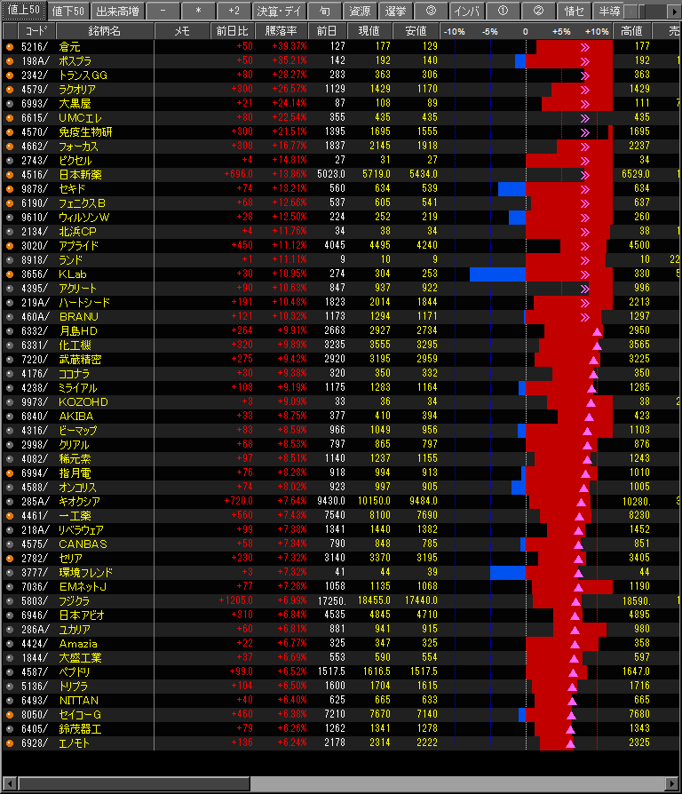 ・寄り付きが安値で下がることなく一気に上に張り付き