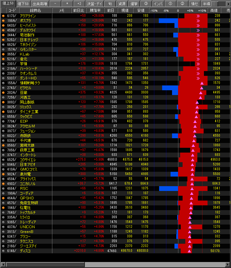 ・RSCが暴れていたのとヒーハイストが特買いやったので、寄り付き跳ねるかもと一瞬だけ入ってりかく➡その後、連買い&特買いなど買い圧力が強くストップ高まで