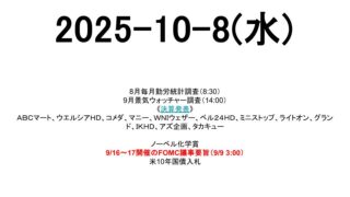 未分類 2025-10-8(水) 市場スケジュール海外ノーベル化学賞9/16~17開催のFOMC議事要旨(9/9 3:00)米10年国債入札国内8月毎月勤労統計調査(8:30)9月景気ウォッチャー調査(14:00)《決算発表》ABCマート、ウエルシアHD、コメダ、マニー、W... 2025.10.08 未分類