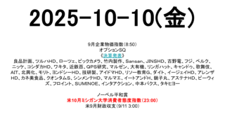 未分類 2025-10-10(金) 市場スケジュール海外ノーベル平和賞米10月ミシガン大学消費者態度指数(23:00)米9月財政収支(9/11 3:00)国内9月企業物価指数(8:50)オプションSQ《決算発表》良品計画、ツルハHD、ローツェ、ビックカメラ、竹内製作、Sans... 2025.10.10 未分類