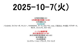 未分類 2025-10-7-(火) 市場スケジュール海外ノーベル物理学賞米8月貿易収支(21:30)米8月消費者信用残高(9/8 4:00)米3年国債入札《米決算発表》コンステレーション・ブランズ、マコーミック国内8月家計調査8:30)8月景気動向指数(14:00)30年国債... 2025.10.07 未分類