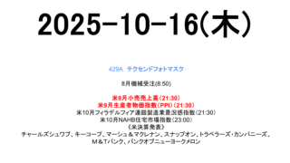 未分類 2025-10-16(木) 市場スケジュール海外米9月小売売上高(21:30)米9月生産者物価指数(PPI)(21:30)米10月フィラデルフィア連銀製造業景況感指数(21:30)米10月NAHB住宅市場指数(23:00)《米決算発表》チャールズシュワブ、キーコープ、... 2025.10.16 未分類