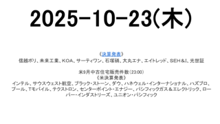 弱い日 2025-10-23(木) 市場スケジュール海外米9月中古住宅販売件数(23:00)《米決算発表》インテル、サウスウェスト航空、ブラック・ストーン、ダウ、ハネウェル・インターナショナル、ハズブロ、プール、Tモバイル、テクストロン、センターポイント・エナジー、パシフィッ... 2025.10.23 弱い日未分類