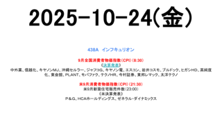 未分類 2025-10-24(金) 市場スケジュール海外米9月消費者物価指数(CPI)(21:30)米9月新築住宅販売件数(23:00)《米決算発表》P&G、HCAホールディングス、ゼネラル・ダイナミックス国内9月全国消費者物価指数(CPI)(8:30)《決算発表》中外薬、信... 2025.10.24 未分類