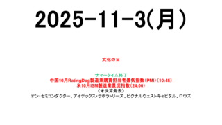 市場スケジュール海外中国10月RatingDog製造業購買担当者景気指数(PMI)(10:45)米10月ISM製造業景況指数(24:00)《米決算発表》オン・セミコンダクター、アイデックス・ラボラトリーズ、ピクナルウェストキャピタル、ロウズ...