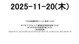 エヌビディア決算通過 2025-11-20(木) 市場スケジュール海外米11月フィラデルフィア連銀製造業景気指数(22:30)米10月中古住宅販売件数(24:00)《米決算発表》ウォルマート、ジェイコブス・エンジニアリング・グループ、インチュイット、ロス・ストアーズ 国内10月首都圏新規マ... 2025.11.20 エヌビディア決算通過リバウンド相場強い日未分類