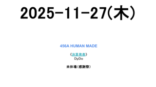 未分類 2025-11-27(木) 市場スケジュール海外米休場(感謝祭)国内456A HUMAN MADE《決算発表》DyDo出典:トレイダーズウェブ 指数 出典:世界株価 Fear & Greed Index 出典:Fear & Greed Index SP500 出典:F... 2025.11.27 未分類
