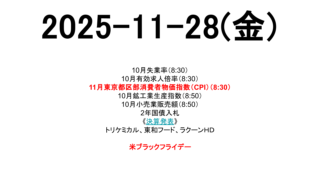未分類 2025-11-28(金) 市場スケジュール海外米ブラックフライデー国内10月失業率(8:30)10月有効求人倍率(8:30)11月東京都区部消費者物価指数(CPI)(8:30)10月鉱工業生産指数(8:50)10月小売業販売額(8:50)2年国債入札《決算発表》トリ... 2025.11.28 未分類