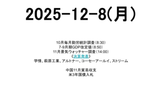 未分類 2025-12-8(月) 市場スケジュール海外中国11月貿易収支米3年国債入札 国内10月毎月勤労統計調査(8:30)7-9月期GDP改定値(8:50)11月景気ウォッチャー調査(14:00)《決算発表》学情、萩原工業、アルトナー、コーセーアールイ、ストリーム出典:... 2025.12.08 未分類