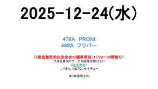 未分類 2025-12-24(水) 市場スケジュール海外米7年国債入札国内IPO 478A PRONI 489A フツバー日銀金融政策決定会合の議事要旨(10/29~30開催分)11月企業向けサービス価格指数(8:50)《決算発表》ニイタカ、NaITO、セキチュー 指数... 2025.12.24 未分類