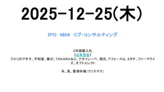 未分類 2025-12-25(木) 市場スケジュール海外米、英、香港休場(クリスマス)国内IPO 480A リブ・コンサルティング2年国債入札《決算発表》クスリのアオキ、平和堂、象印、TAKARA&C、ナガイレーベ、瑞光、FフォースG、ミタチ、ファーマライズ、オプトエレクト ... 2025.12.25 未分類