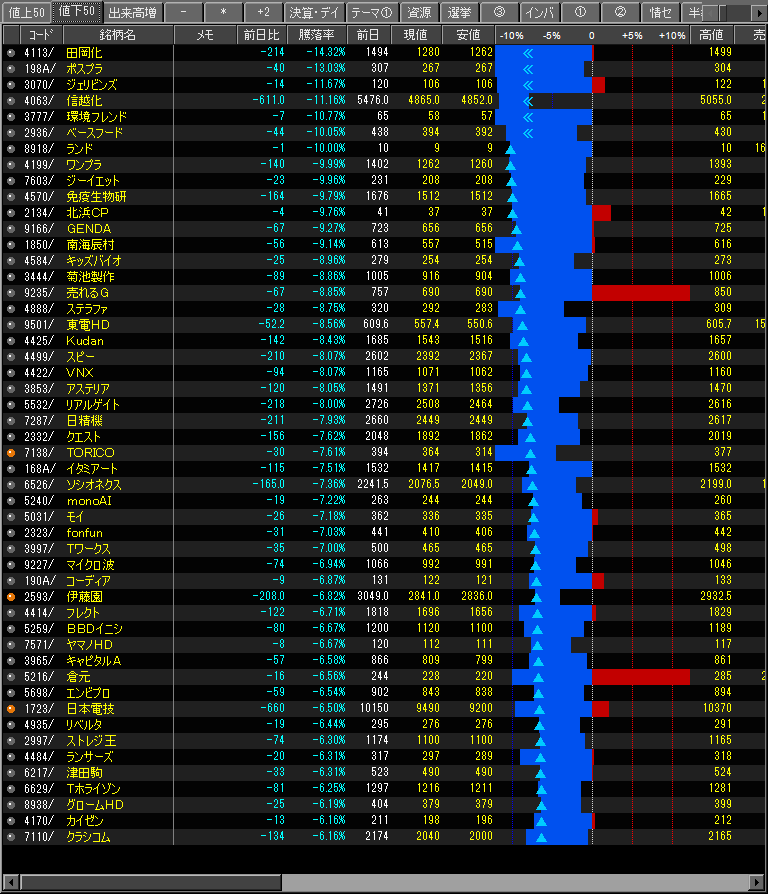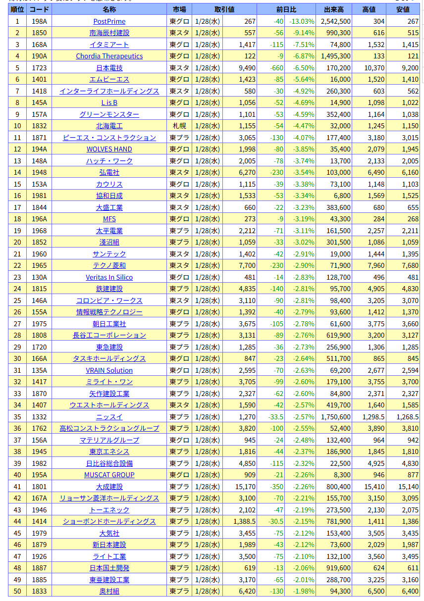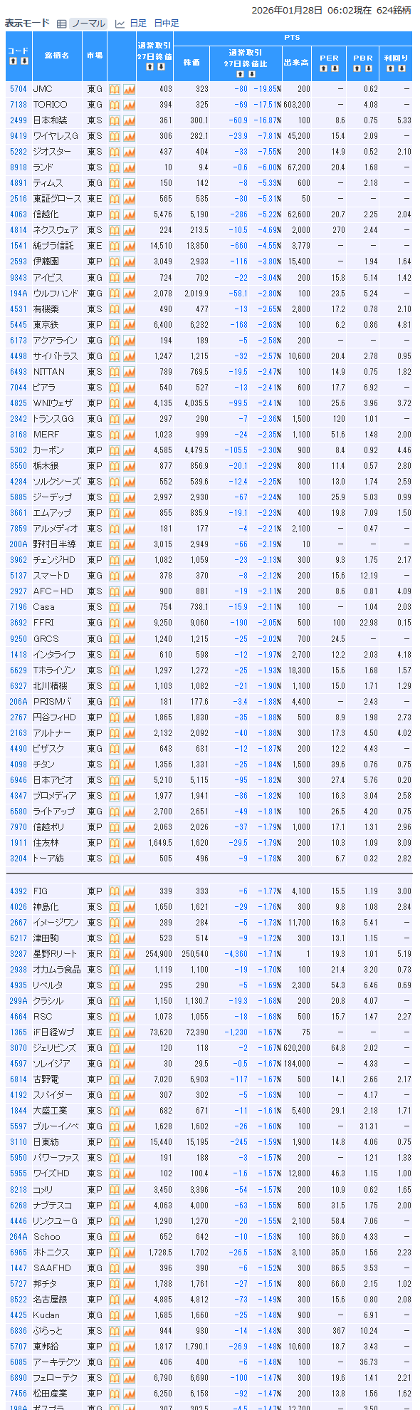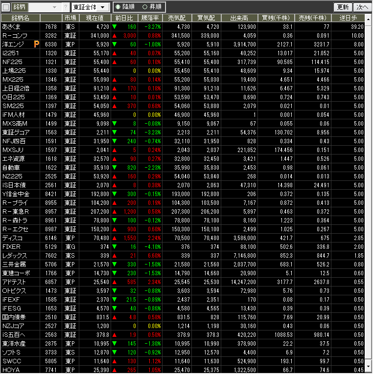 アドバンテ、野村不HD、キヤノンMJ、エクセディ、松井証航空電、メタウォーター、日本電技、キヤノン電、ジャフコG、一工薬、JCRファーマ、秋田銀、ナガセ、JFE-SI、日精化、極東証券、アイザワ証G、KOA、北電事、日精線、杉本商、田岡化、オーゼックス、NTTDIM、南海辰村、大丸エナ、FDK、ダイトーケミ、エイトレッド、広栄化学、クレオ、こころNT日興業、植松商、ムラキ