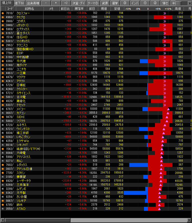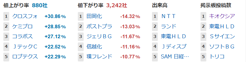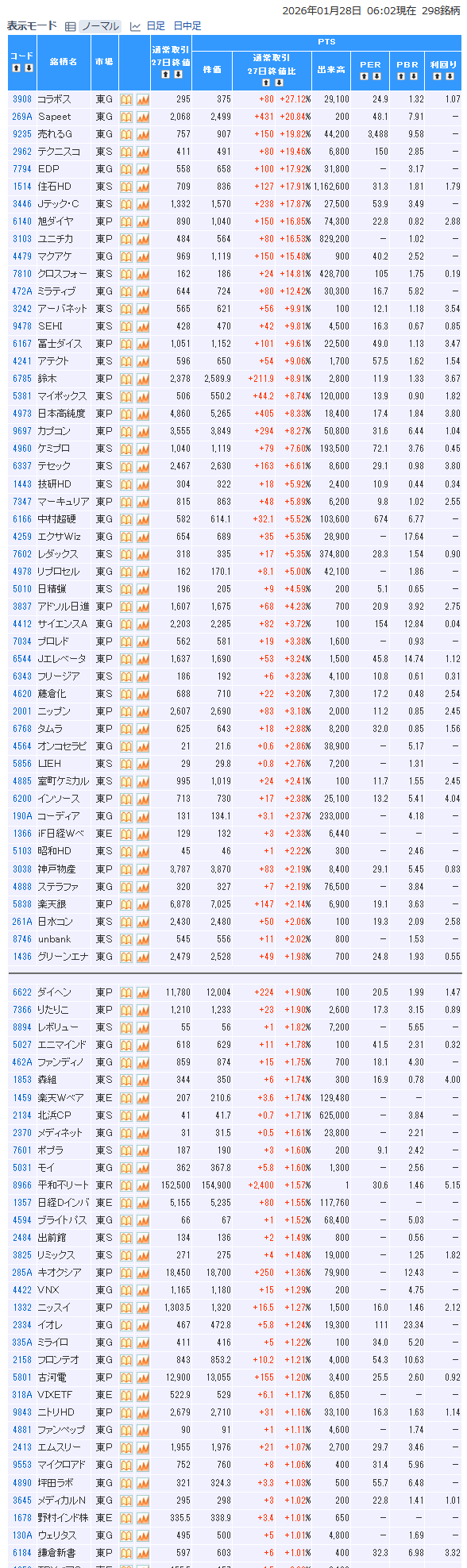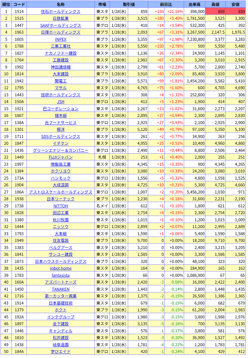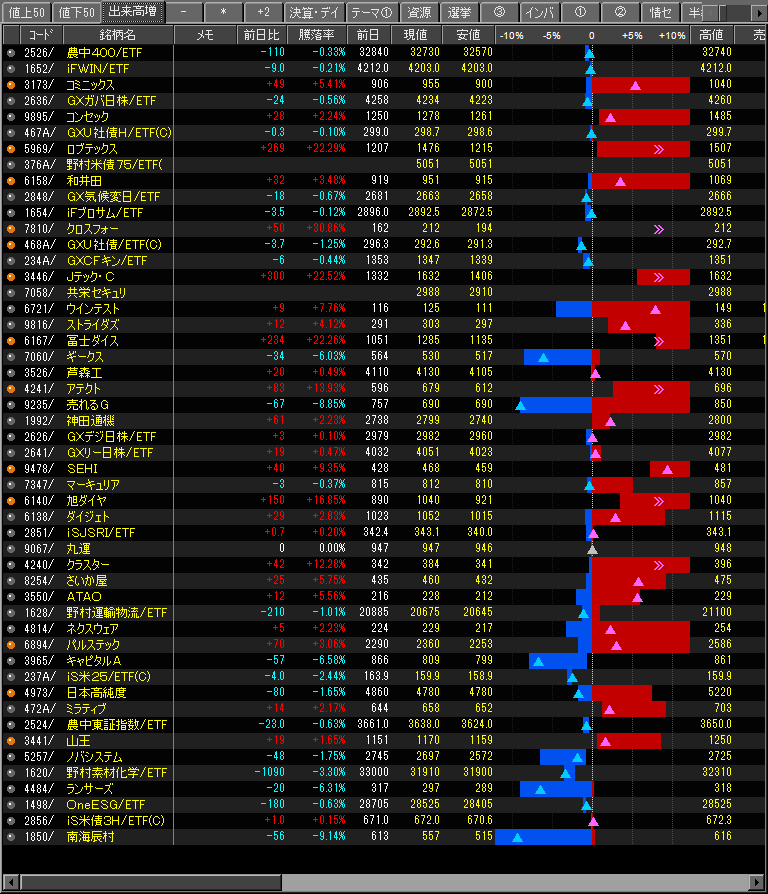 アドバンテ、野村不HD、キヤノンMJ、エクセディ、松井証航空電、メタウォーター、日本電技、キヤノン電、ジャフコG、一工薬、JCRファーマ、秋田銀、ナガセ、JFE-SI、日精化、極東証券、アイザワ証G、KOA、北電事、日精線、杉本商、田岡化、オーゼックス、NTTDIM、南海辰村、大丸エナ、FDK、ダイトーケミ、エイトレッド、広栄化学、クレオ、こころNT日興業、植松商、ムラキ