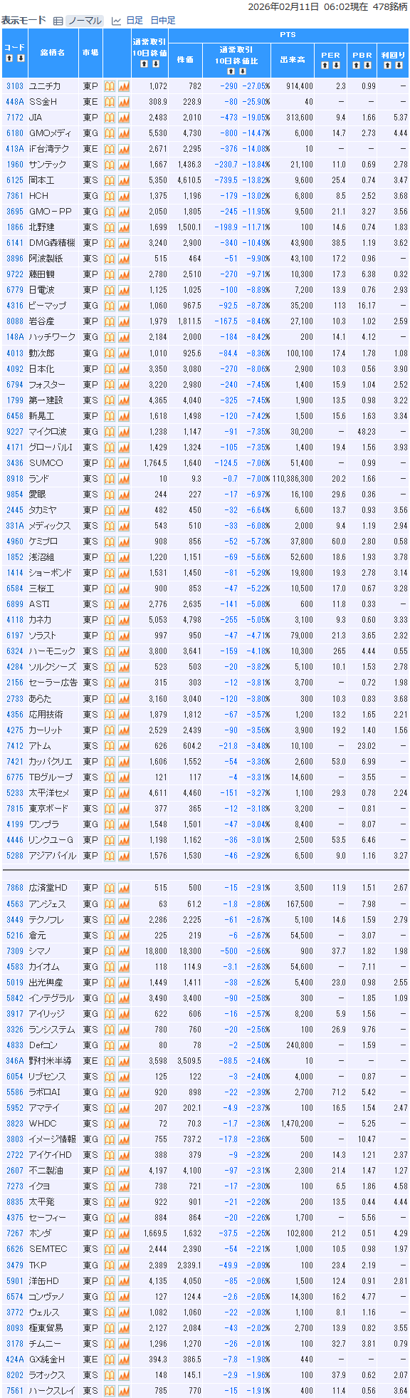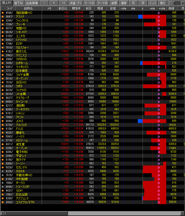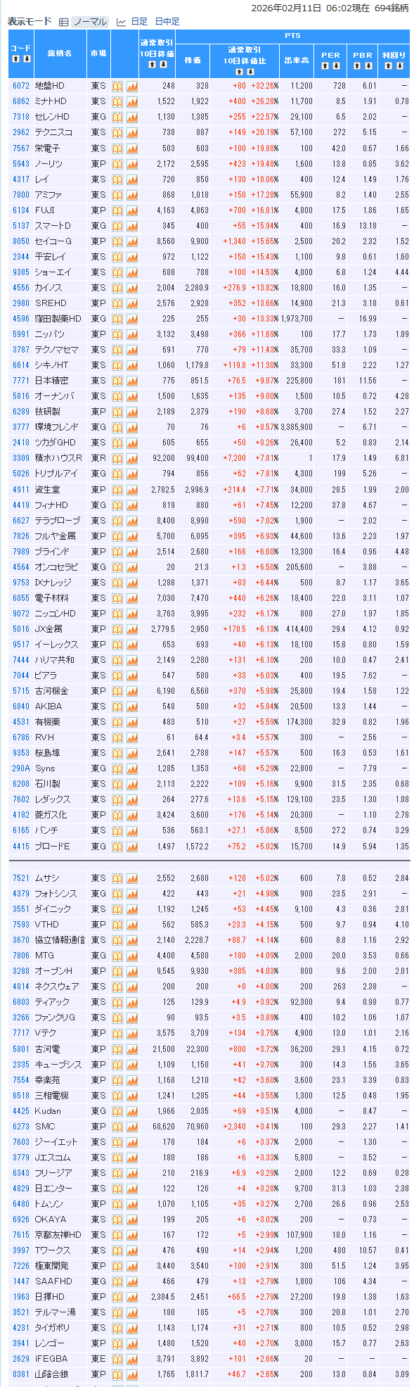 ソフトバンクG、キオクシアHD、JT、INPEX、SMC、鹿島、ネクソン、パンパシHD、クボタ、ダイフク、楽天G、光通信、いすゞ、ユニチャーム、KOKUSAI、サントリーBF、しずおか、日産自、ゼンショーHD、西武HD、サンリオ、明治HD、シスメックス、山崎パン、GMOPG、住友ゴム、アマダ、三菱マ、KADOKAWA、トライアル、テクセンド、サイボウズ、RIZAPG、カバー、トヨコー、ライオン事務、フツパー、フラー