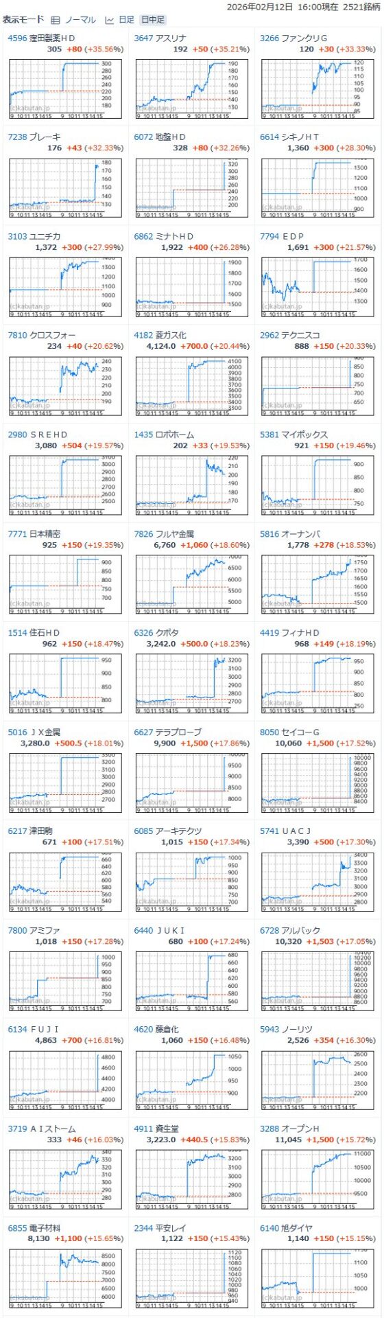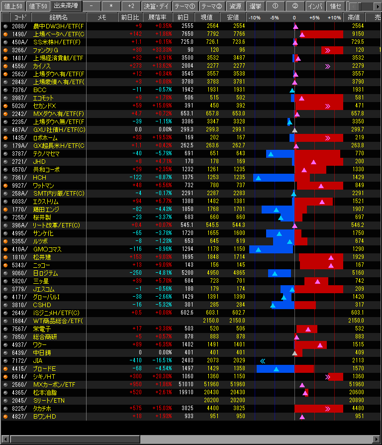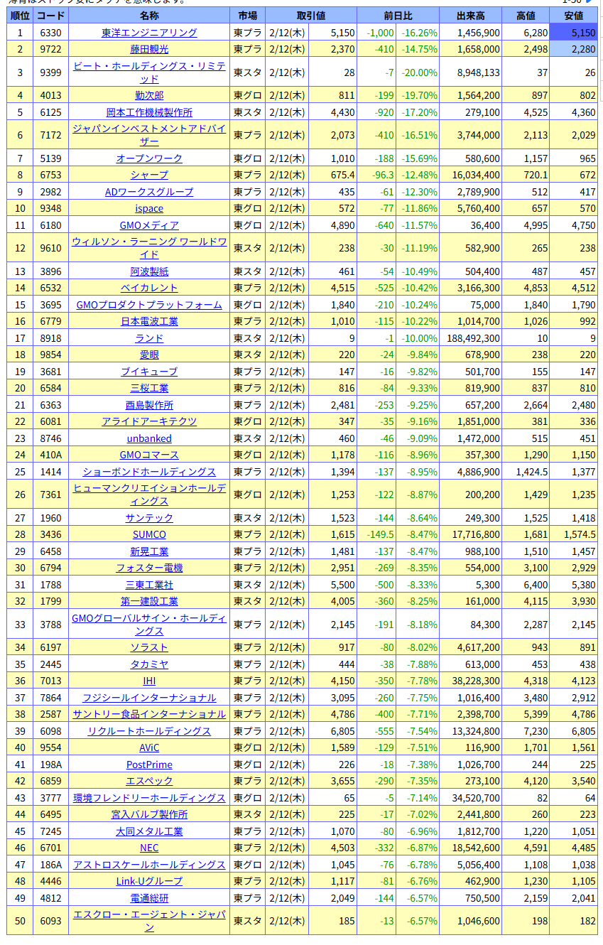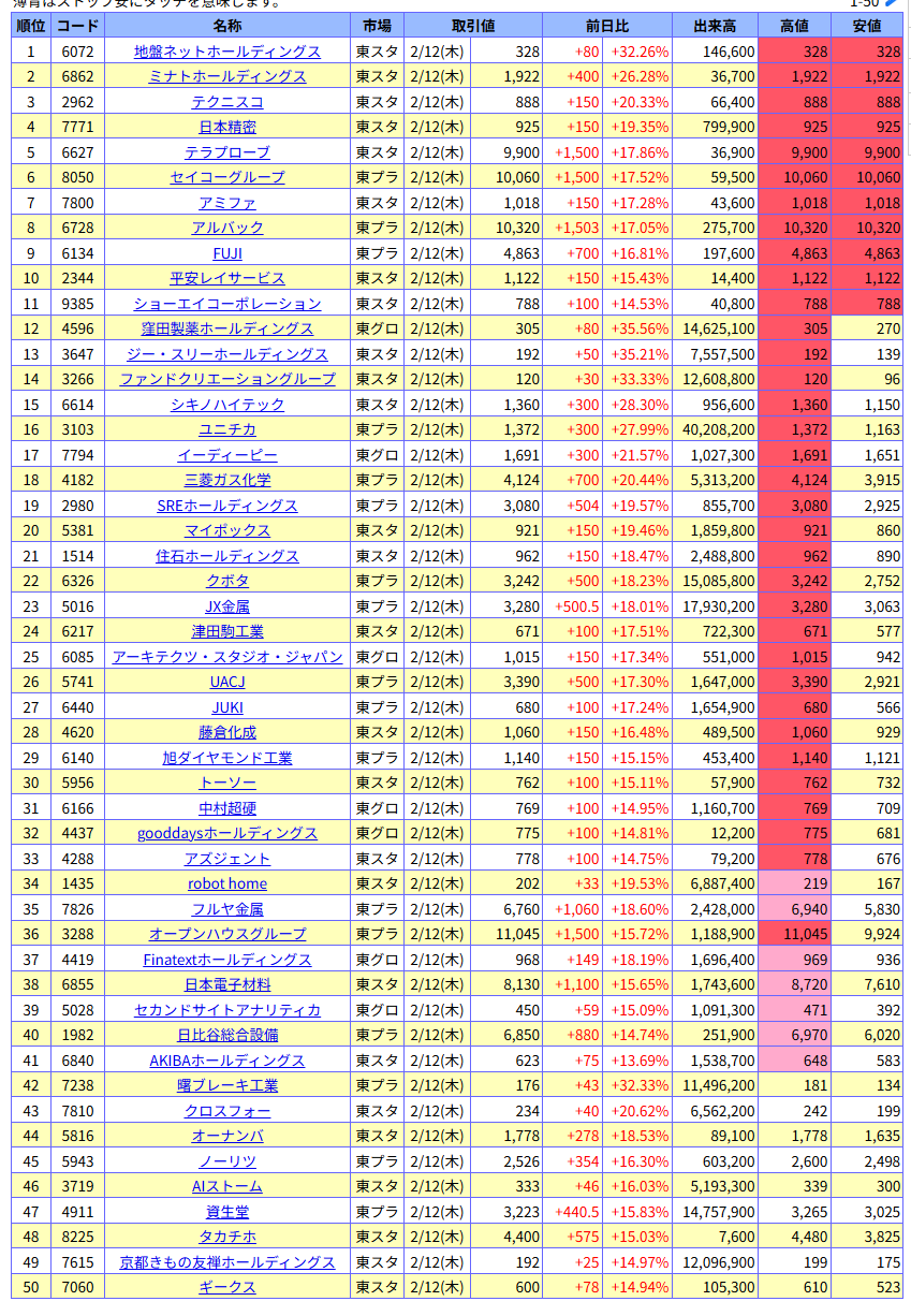 ソフトバンクG、キオクシアHD、JT、INPEX、SMC、鹿島、ネクソン、パンパシHD、クボタ、ダイフク、楽天G、光通信、いすゞ、ユニチャーム、KOKUSAI、サントリーBF、しずおか、日産自、ゼンショーHD、西武HD、サンリオ、明治HD、シスメックス、山崎パン、GMOPG、住友ゴム、アマダ、三菱マ、KADOKAWA、トライアル、テクセンド、サイボウズ、RIZAPG、カバー、トヨコー、ライオン事務、フツパー、フラー