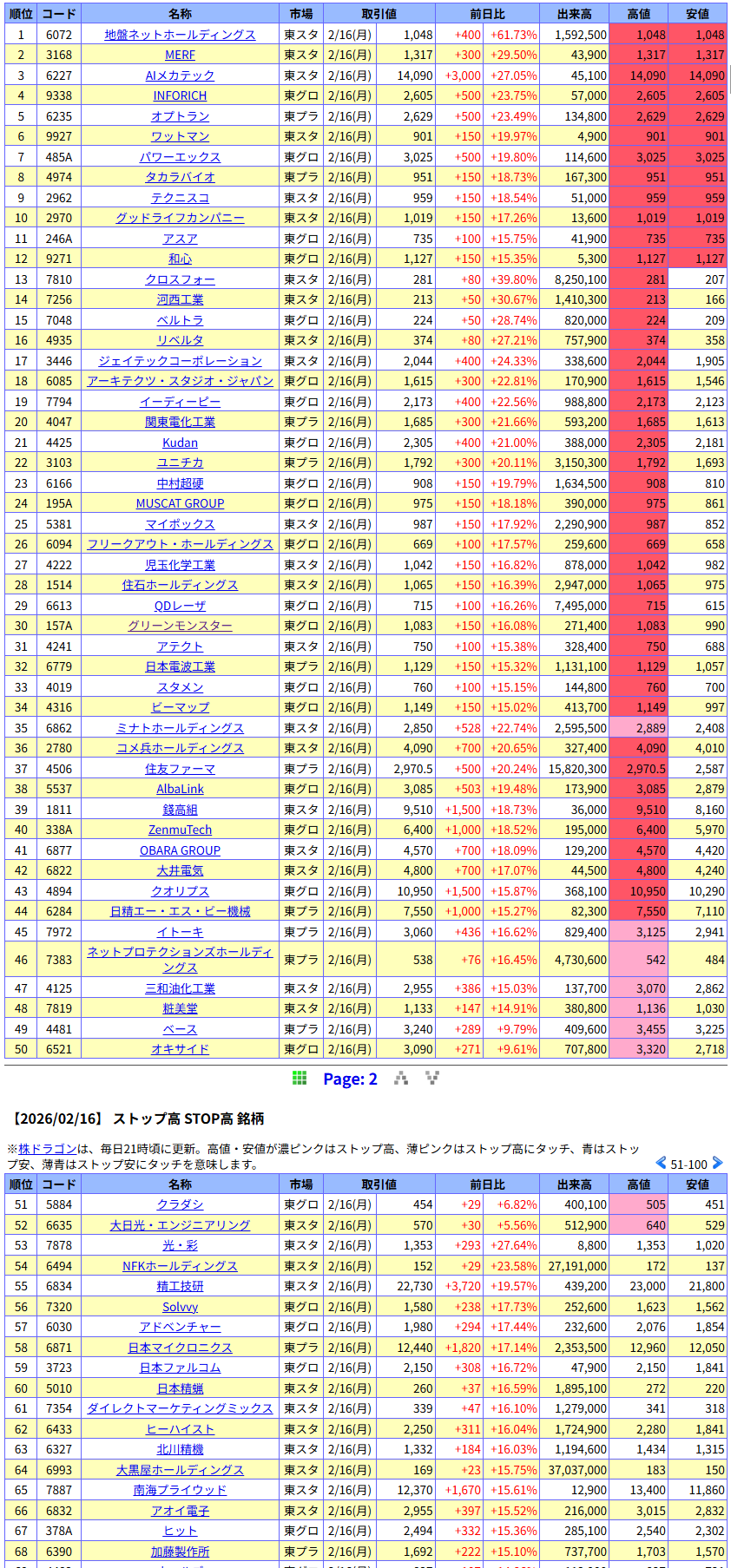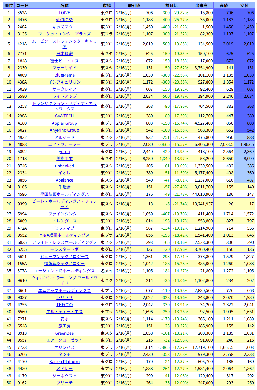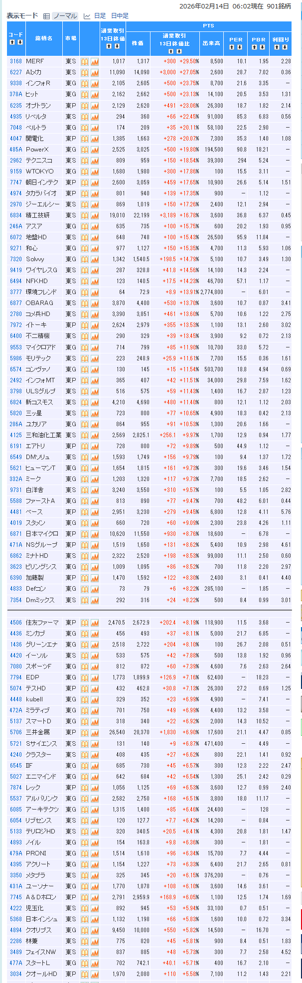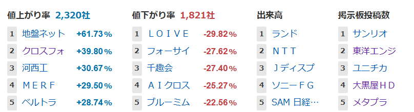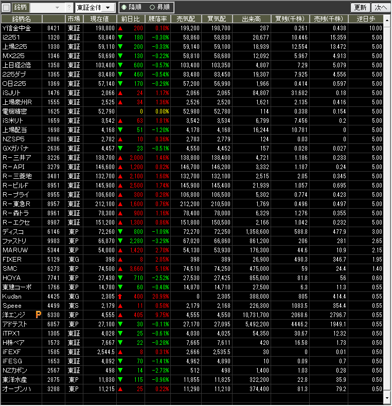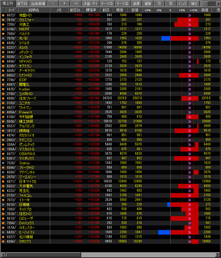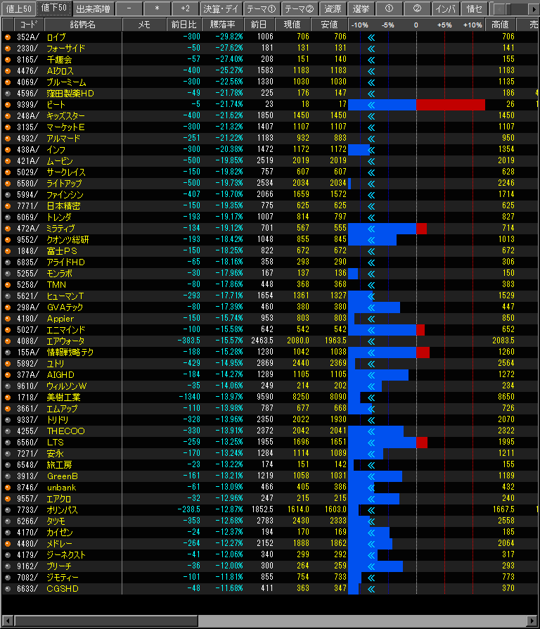 ブリヂストン、メタプラネット、DIC、ペプチド、あいHD、ロイヤルHD、東洋炭素、データSEC、綜研化学、キーコーヒー、ヘリオス、FRONTEO、ポート、カナディアン、キタハマキャピ、イクヨ、あかつき、動物高医、博展、ウィルズ、倉元、グリッド、サニックスHD、平山、Abalance、片倉コープ、くふうC、カヤック、フリージアマク、トミタ、トスネット、スカラ、河西工、PSS、ウインテスト、技研HD、DLE、日精蝋、いちごグ、辻・本郷、キューブ、大日光、レアジョブ、ピーエイ、ズーム、夢隊、フライト、リカバリー、フジタコーポ、シリウスV