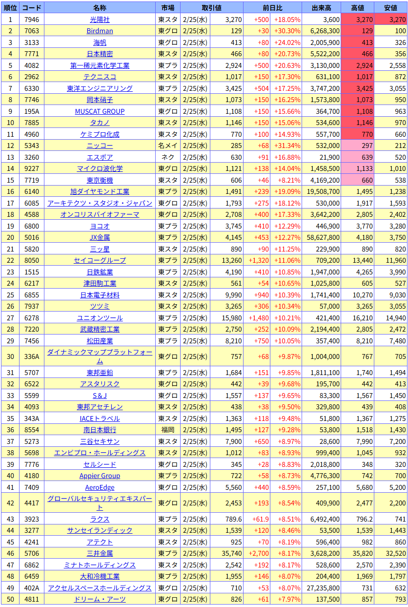 値上がり率ランキング