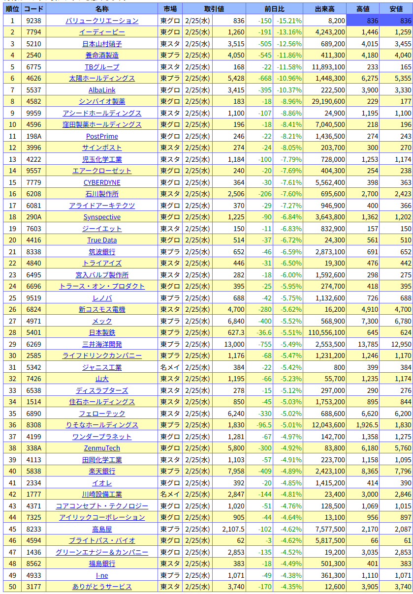 値下がり率ランキング
