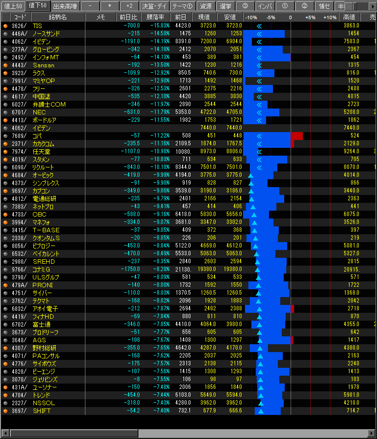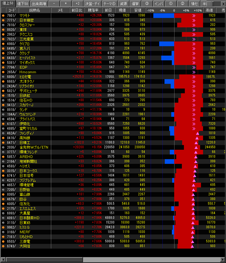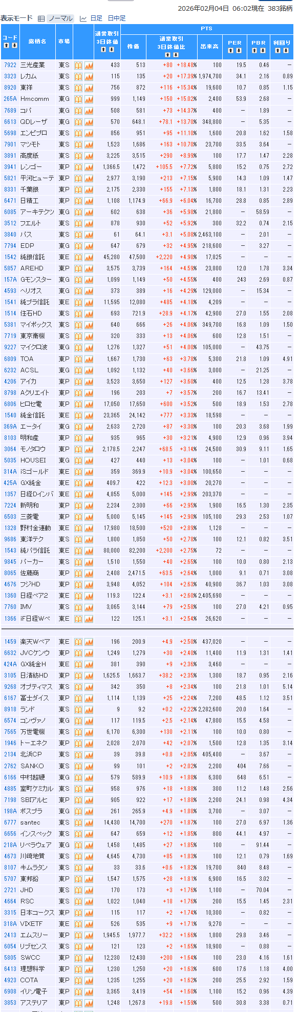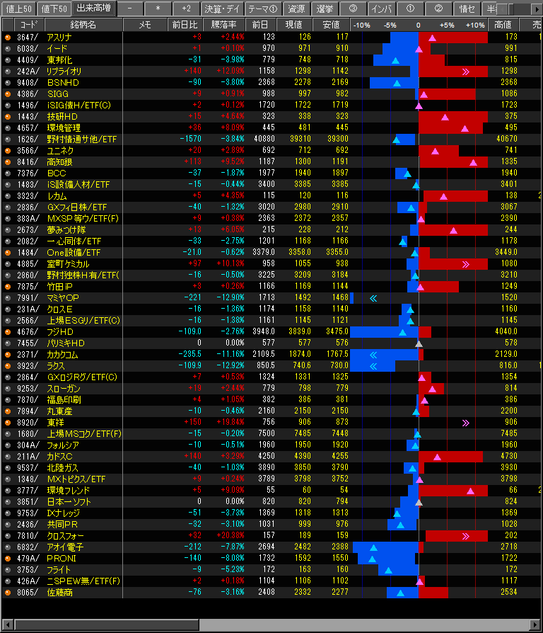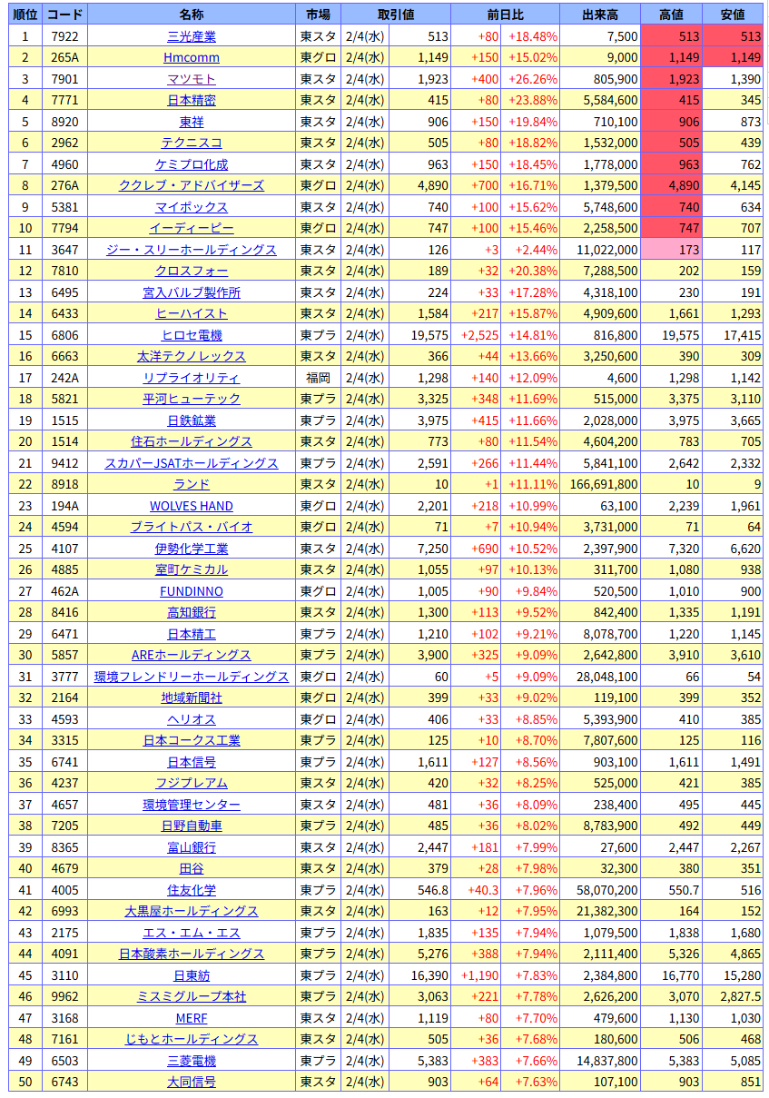 三菱UFJ、三菱重、丸紅、住友商、ダイキン、パナソニックH、アステラス薬、LINEヤフー、SBI、郵船、旭化成、日本酸素、SBI新生、エムスリー、ローム、ふくおか、オルガノ、スカパーJSA、太陽HD、ヤマハ、東武、BIPROGY、ちゅうぎ、カカクコム、空港ビル、GSユアサ、あおぞら、帝人、UBE、H2Oリテイル、オークマ、稲畑産、エフ・シー・シー、ガリレイ、トーカロ、ニシオHD、山一電、ホーチキ、富士急、GMOFHD、第一実、杏林製薬、バルカー、松風、ミロク情報、コロプラ、三交GHD