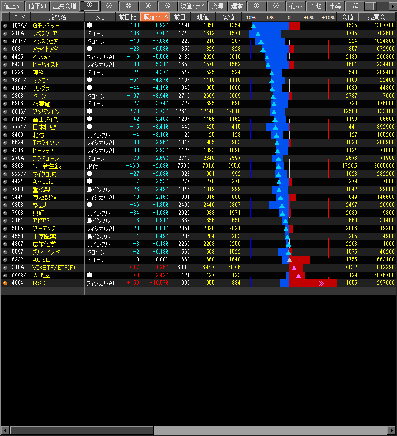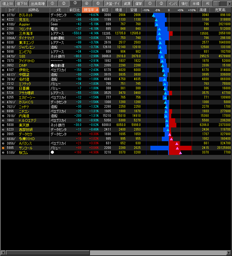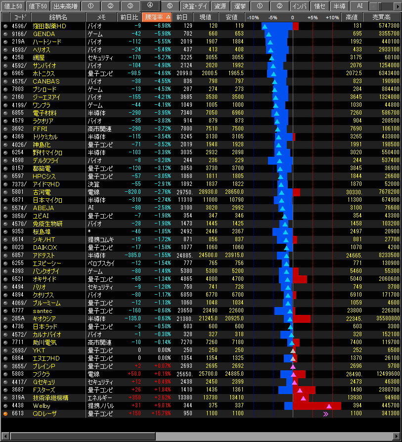・全体的に弱く、直近まで賑わっていた個別銘柄が総崩れ
