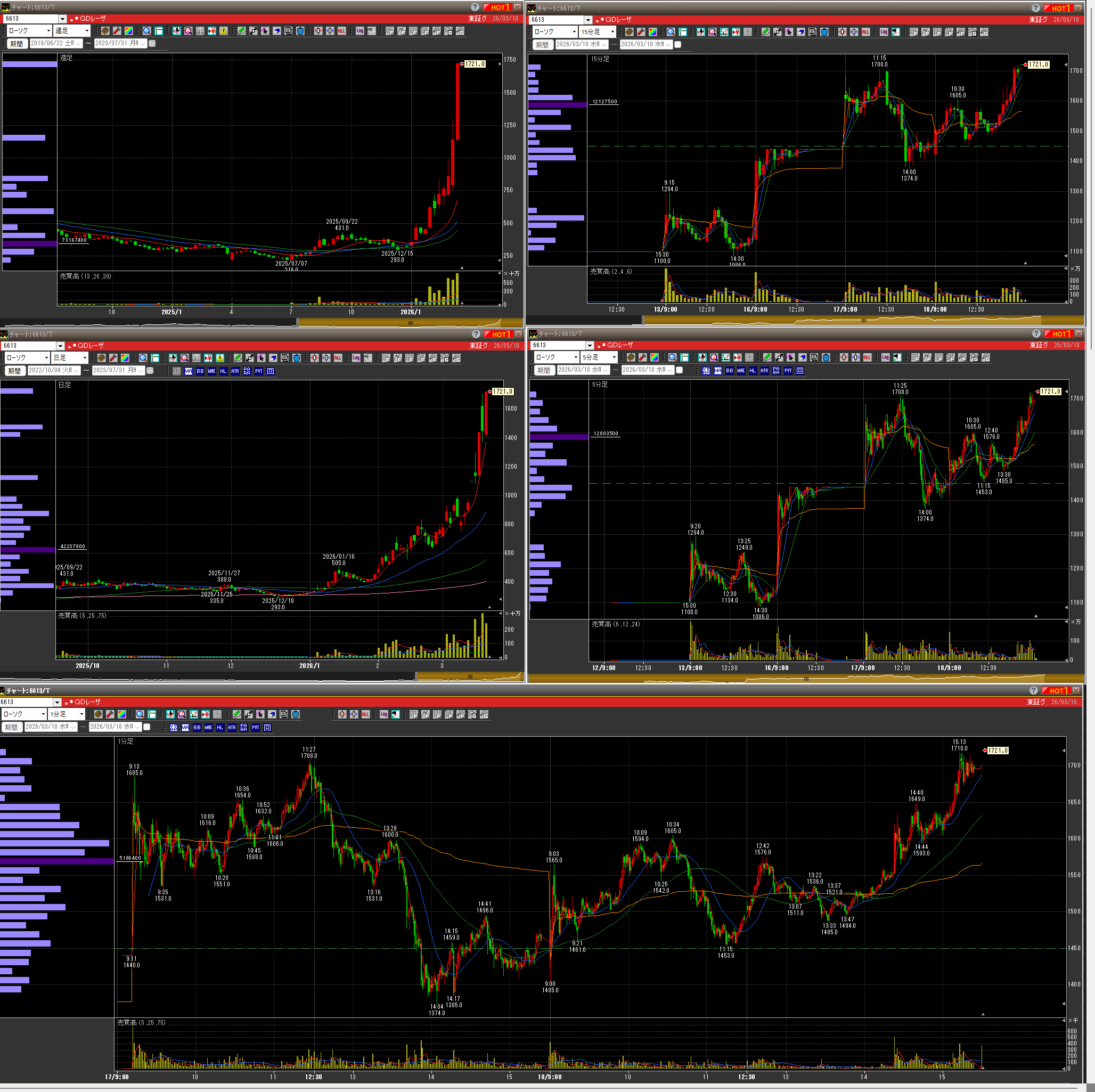半分同値撤退して下で買いなおす準備をするのが安定したトレードなんでしょうが、ぶち上げそうなので迷う
