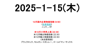 2026-1 2026-1-15(木) 市場スケジュール海外米12月小売売上高(22:30)米12月輸出物価指数(22:30)米12月輸入物価指数(22:30)《米決算発表》ブラックロック、モルガン・スタンレー、ゴールドマン・サックス国内12月国内企業物価指数(8:50)《決算発... 2026.01.15 2026-1未分類
