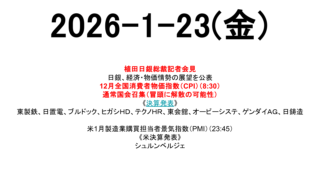 未分類 2026-1-23(金) 市場スケジュール海外米1月製造業購買担当者景気指数(PMI)(23:45)《米決算発表》シュルンベルジェ 国内植田日銀総裁記者会見日銀、経済・物価情勢の展望を公表12月全国消費者物価指数(CPI)(8:30)通常国会召集(冒頭に解散の可能性... 2026.01.26 未分類