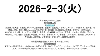 未分類 2026-2-3(火) 市場スケジュール海外12月雇用動態調査(JOLTS)求人件数(24:00)《米決算発表》マラソン・ペトロリアム、ペイパル・ホールディングス、メルク、ファイザー、イートン、ペンテア、アーチャー・ダニエルズ、ブロードリッジ・フィナンシャル・ソリ... 2026.02.03 未分類
