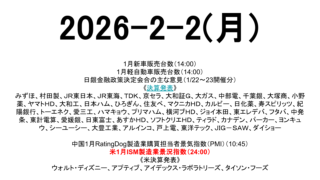 未分類 2026-2-4(水) 市場スケジュール海外米1月ADP雇用統計(22:15)米1月ISM非製造業景況指数(24:00)《欧決算発表》アーム・ホールディングス《米決算発表》アルファベット、クアルコム、アフラック、ボストン・サイエンティフィック、CMEグループ、コグ... 2026.02.04 未分類