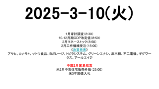 リバウンド 2026-3-10(火) 市場スケジュール海外中国2月貿易収支米2月中古住宅販売件数(23:00)米3年国債入札国内1月家計調査(8:30)10-12月期GDP改定値(8:50)2月マネーストック(8:50)2月工作機械受注(15:00)《決算発表》アサヒ、カナモト... 2026.03.10 リバウンド強い日戦争未分類