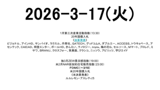 寄り天 2026-3-17(火) 市場スケジュール海外独3月ZEW景況感指数(19:00)米2月NAR仮契約住宅販売指数(23:00)FOMC(~3/18)米20年国債入札《米決算発表》ルルレモン・アスレティカ国内1月第三次産業活動指数(13:30)20年国債入札《決算発表... 2026.03.17 寄り天未分類