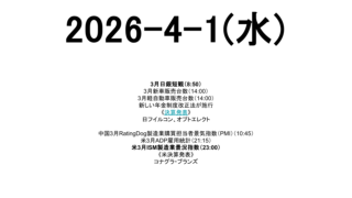 強い日 2026-4-1(水) 市場スケジュール海外中国3月RatingDog製造業購買担当者景気指数(PMI)(10:45)米3月ADP雇用統計(21:15)米3月ISM製造業景況指数(23:00)《米決算発表》コナグラ・ブランズ国内3月日銀短観(8:50)3月新車販売... 2026.04.01 強い日未分類