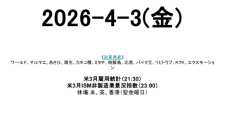 未分類 2026-4-3(金) 市場スケジュール海外米3月雇用統計(21:30)米3月ISM非製造業景況指数(23:00)休場:米、英、香港(聖金曜日)国内《決算発表》ワールド、マルマエ、あさひ、瑞光、カネコ種、ミタチ、暁飯島、北恵、バイク王、リヒトラブ、KTK、エクスモ... 2026.04.03 未分類雇用統計