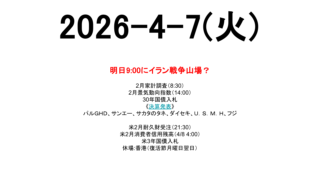戦争 2026-4-7(火) 市場スケジュール海外米2月耐久財受注(21:30)米2月消費者信用残高(4/8 4:00)米3年国債入札休場:香港(復活節月曜日翌日) 国内2月家計調査(8:30)2月景気動向指数(14:00)30年国債入札《決算発表》パルGHD、サンエー... 2026.04.07 戦争未分類