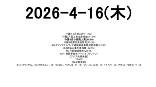 未分類 2026-4-16(木) 市場スケジュール海外中国1-3月期GDP(11:00)中国3月鉱工業生産指数(11:00)中国3月小売売上高(11:00)中国3月固定資産投資(11:00)米4月フィラデルフィア連銀製造業景況感指数(21:30)米3月鉱工業生産指数(22:... 2026.04.16 未分類