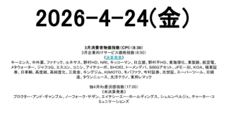 未分類 2026-4-24(金) 市場スケジュール海外独4月Ifo景況感指数(17:00)《米決算発表》プロクター・アンド・ギャンブル、ノーフォーク・サザン、エイチシーエー・ホールディングス、シュルンベルジェ、チャーター・コミュニケーションズ 国内3月消費者物価指数(CPI... 2026.04.24 未分類