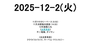 市場スケジュール海外中国11月RatingDogサービス部門購買担当者景気指数(PMI)(10:45)米11月ADP雇用統計(22:15)米9月輸出物価指数(22:30)米9月輸入物価指数(22:30)米11月ISM非製造業景況指数(24:...
