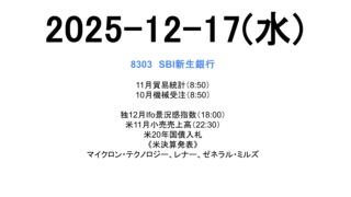 市場スケジュール海外独12月Ifo景況感指数(18:00)米11月小売売上高(22:30)米20年国債入札《米決算発表》マイクロン・テクノロジー、レナー、ゼネラル・ミルズ国内8303 SBI新生銀行11月貿易統計(8:50)10月機械受注(...